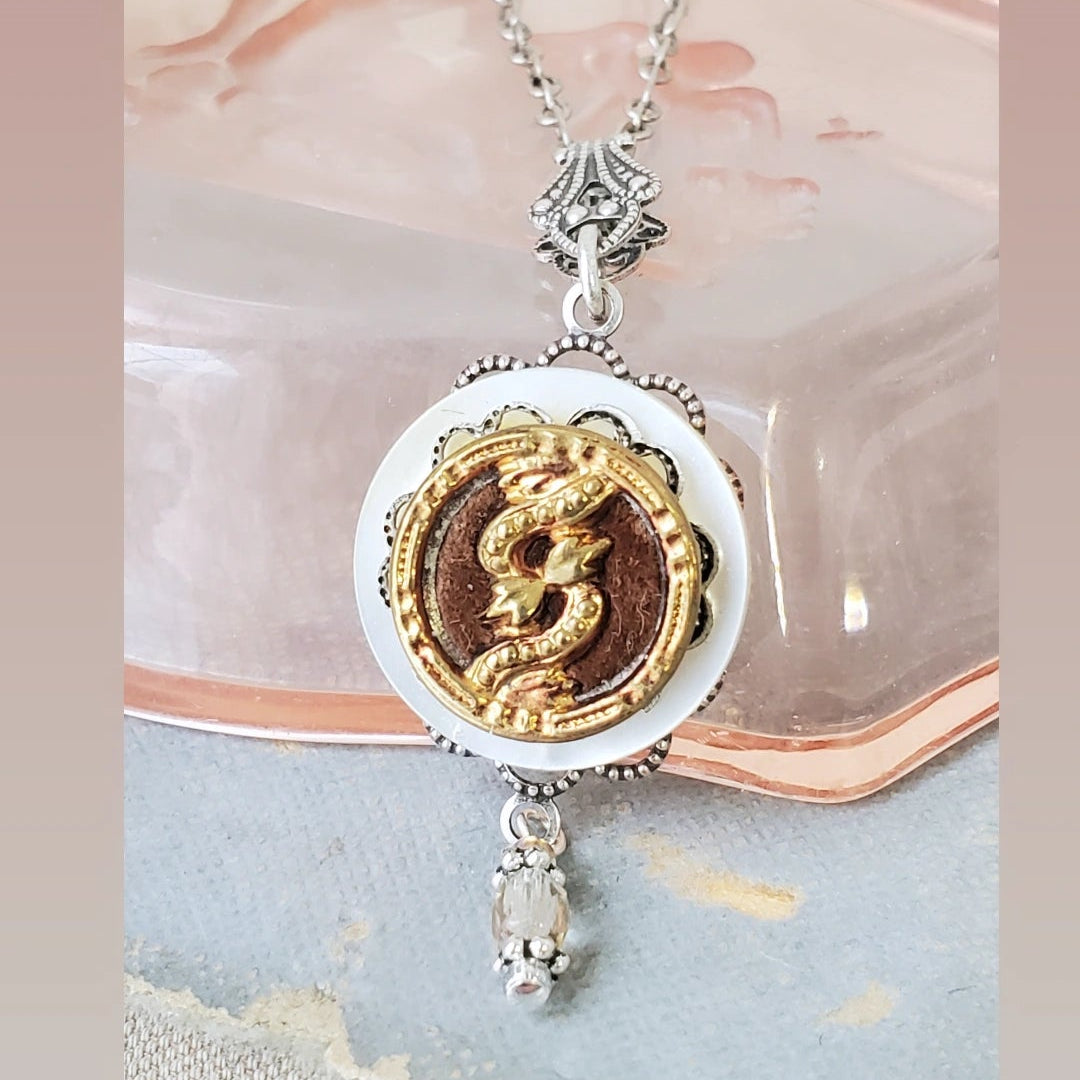 An 1860's perfume button with a ribbon pattern is the focal point on this necklace. The rich amber velvet with gold and silver accents is incredible. A 1920's mother of pearl button adds to the charm. Exquisite.