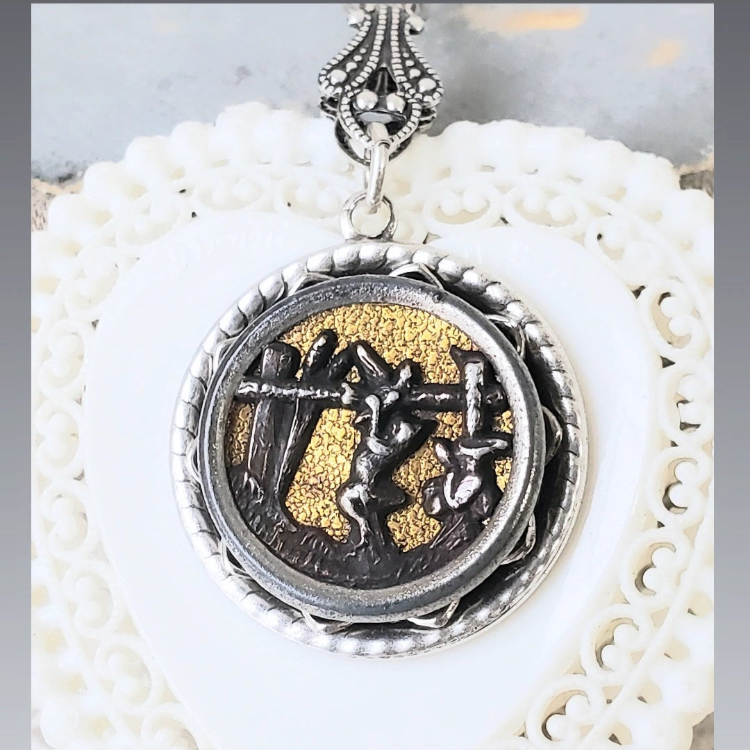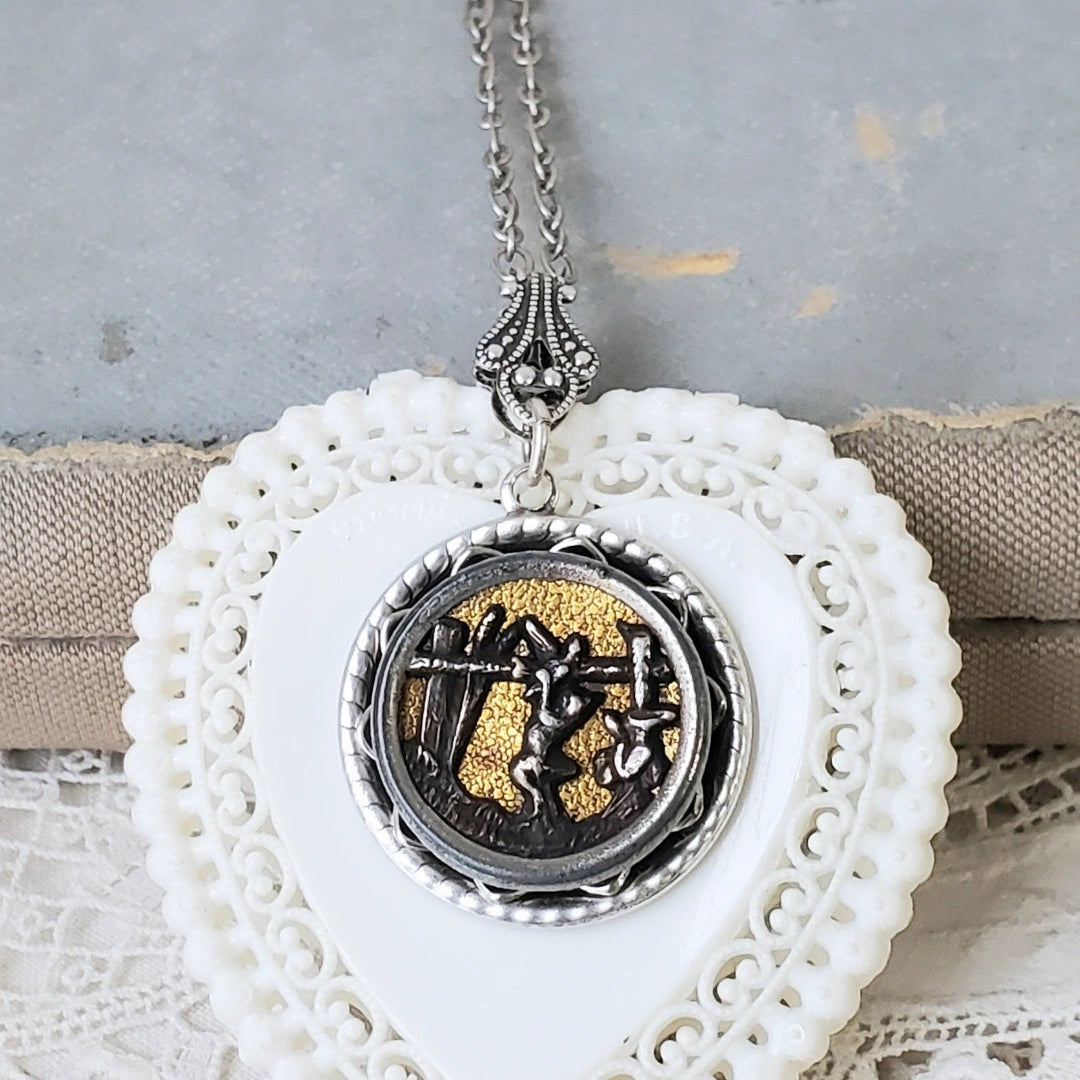 An 1880's button with a cat batting a bird on a fence is the focal point on this necklace. This button is from Paris. The detail is incredible. The silver details on the cat and bird pair perfectly with the matte gold background. Cat lovers...this is for you. It is extremely hard to find buttons with cats on them.