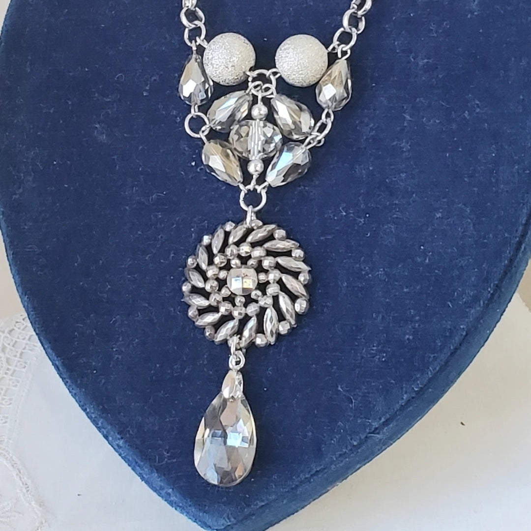 This 1880's Victorian Cut Steel button steals the show on this long necklace. Cut steel buttons were crafted by riveting tiny, faceted, polished steel studs onto a metal base to mimic sparkling diamonds. The light smokey grey glass beads pair perfectly with it adding extra sparkle.
