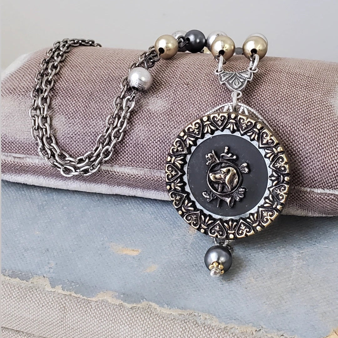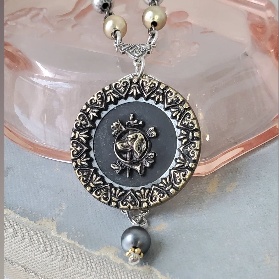 An 1880's Paris button with a dog with horns circling it is the focal point on this necklace. This button symbolizes the Victorians love of hunting with their dogs. The detail is incredible with the regal heart border. The antique gold finish details on the dog and border pair perfectly with the matte black background. Dog lovers...this is for you. It is extremely hard to find antique buttons with dogs on them.
