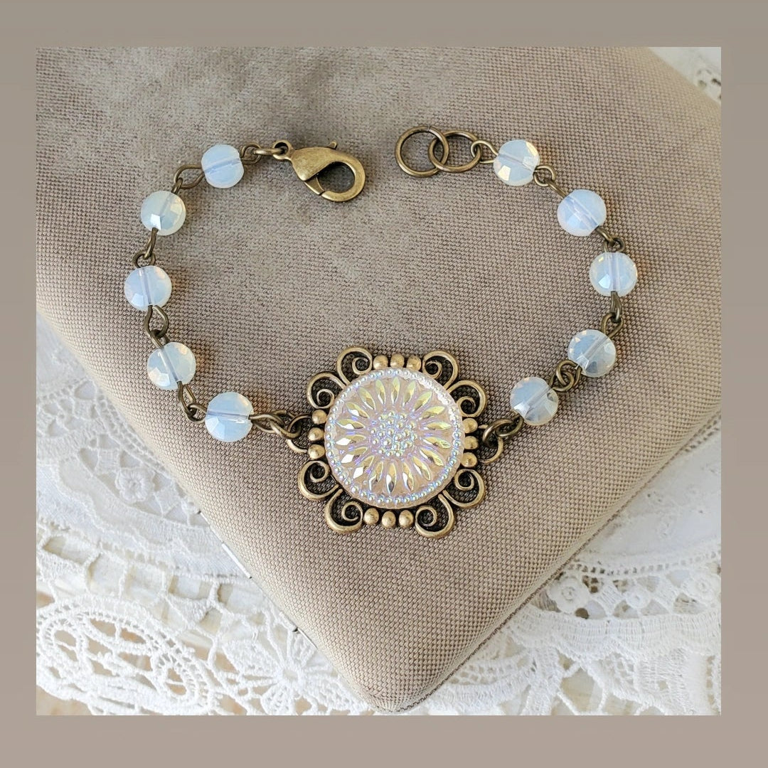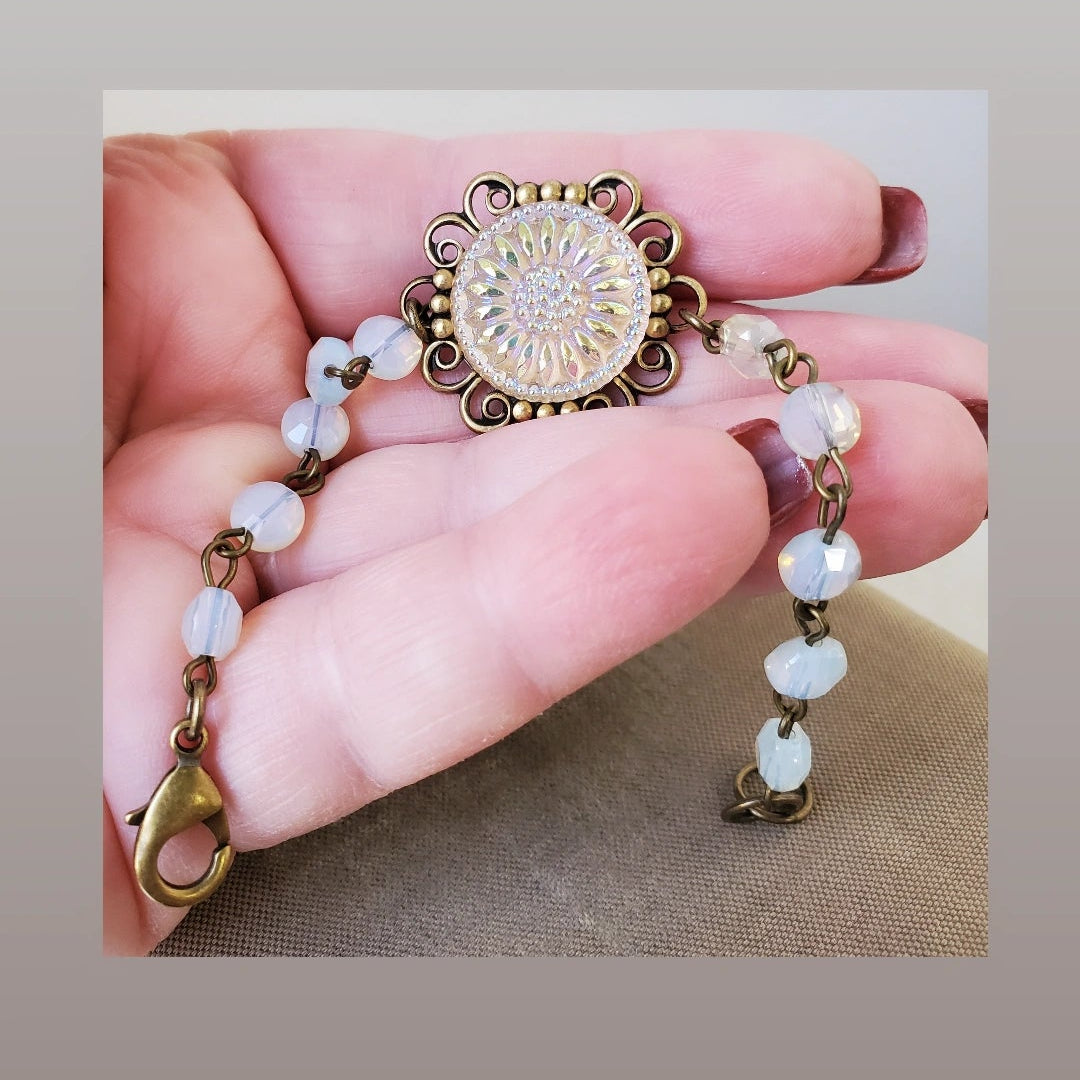 A Czechoslovakian glass sunflower button is the feature of this bracelet. Soft taupe opalescent glass beads compliment the button perfectly. This stunning button changes from gold to white to light blue as it moves. Sunflowers are powerful, positive symbols of loyalty and longevity.