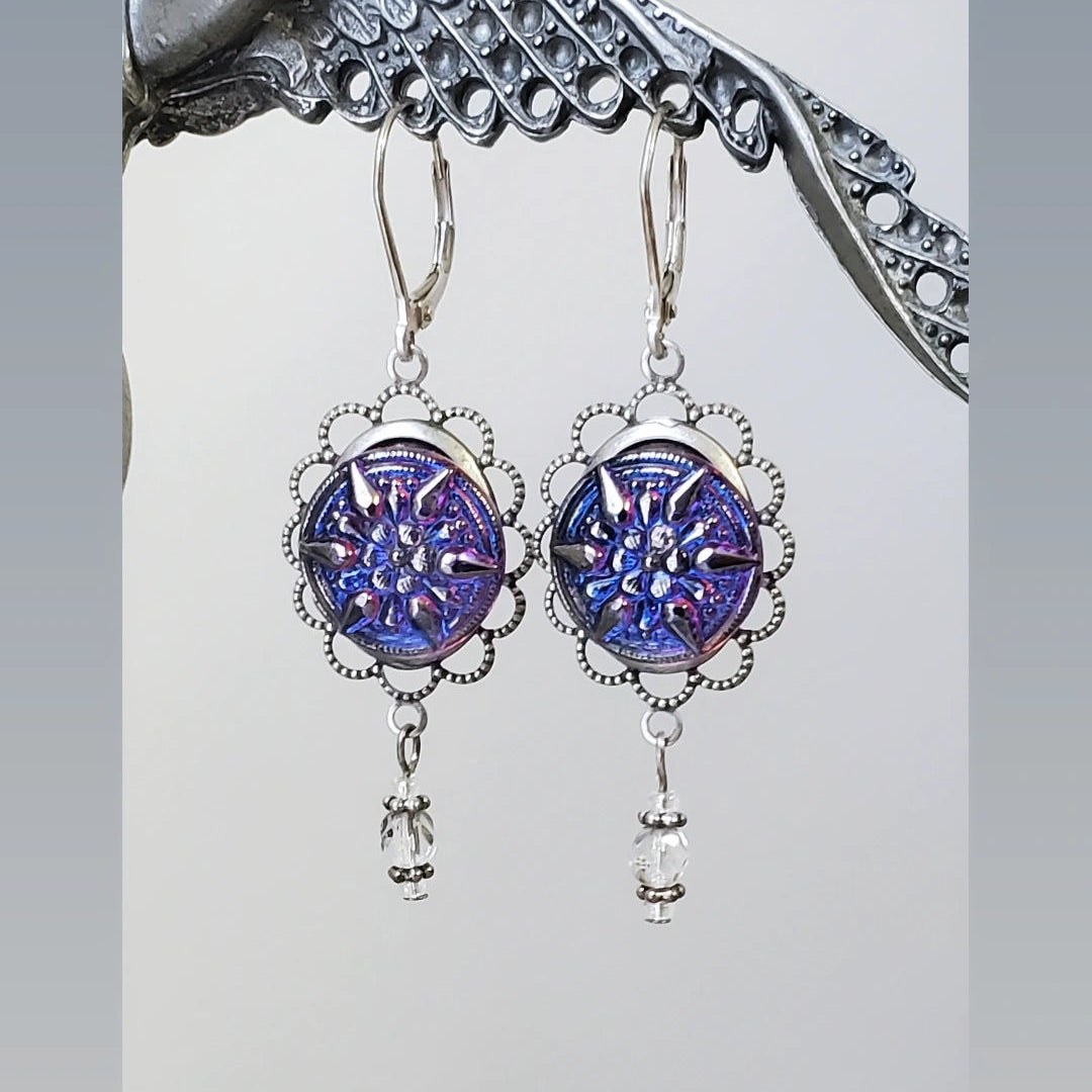 The iridescent glass changes from blue to purple/pink with silver highlights. Stunning in person.