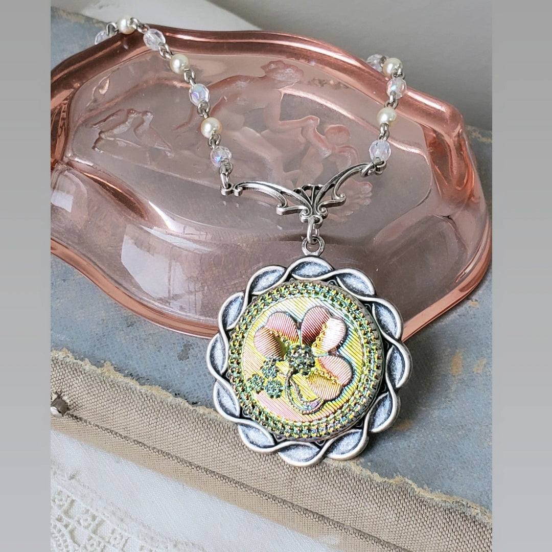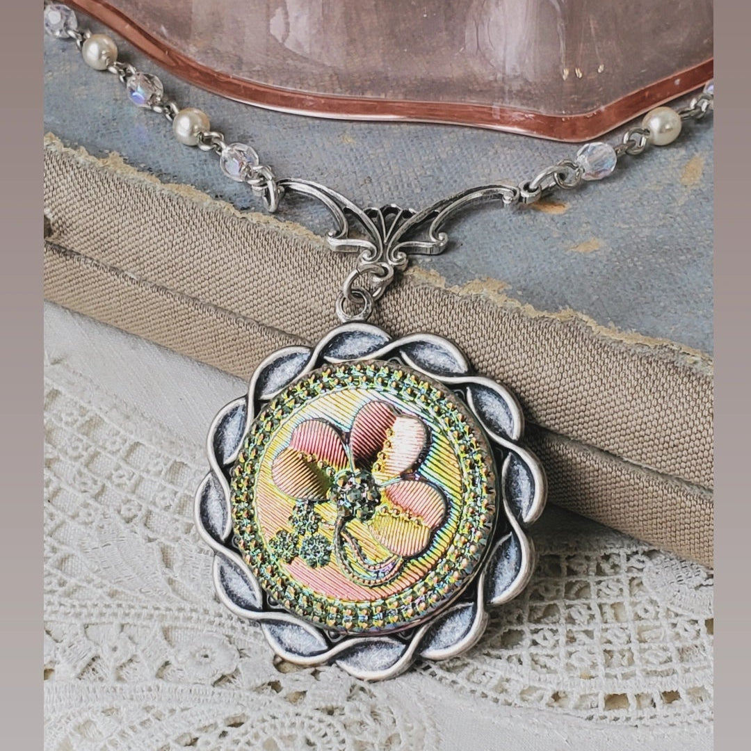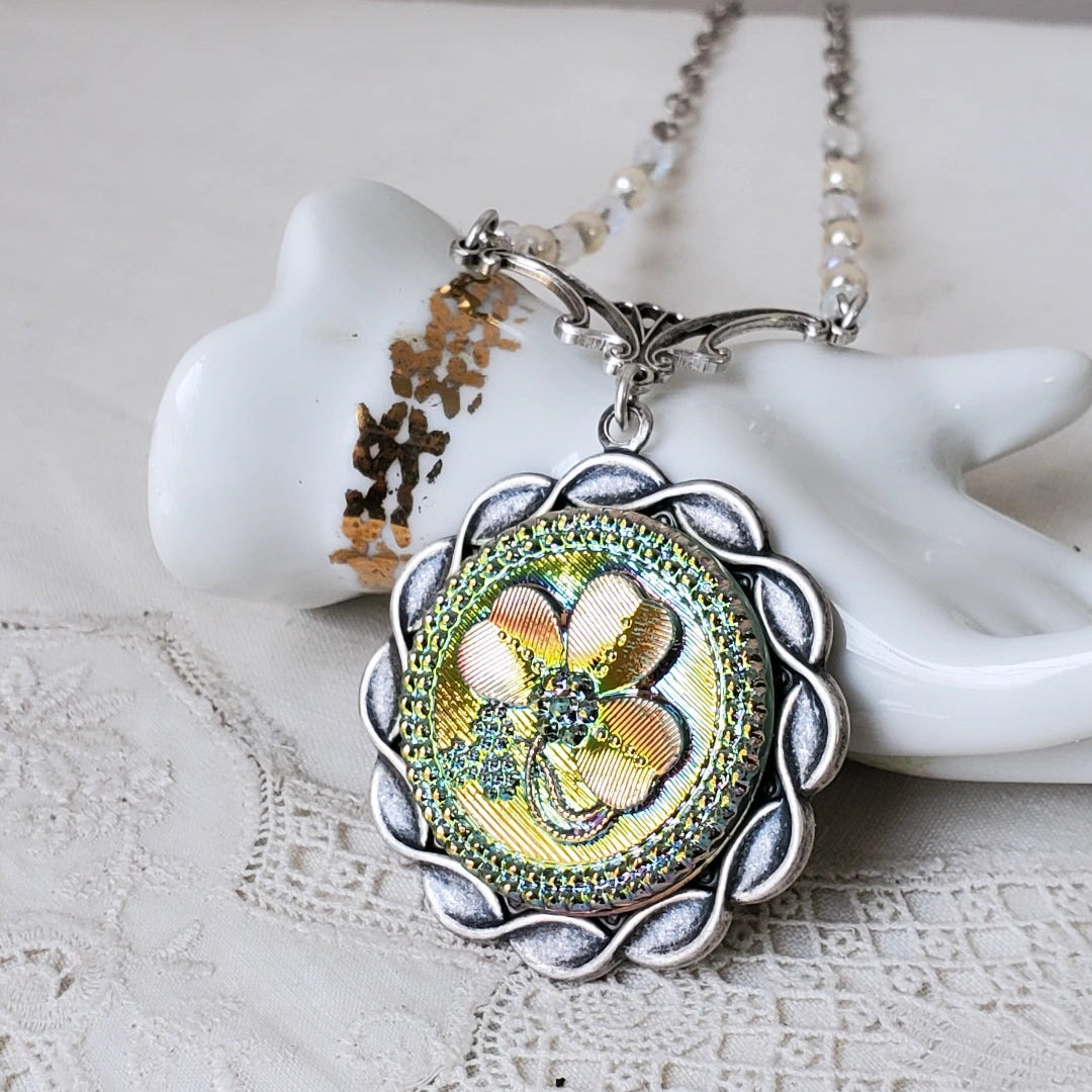 A stunning shamrock is the star of the show on this Czechoslovakian glass button. It shimmers from green to pink to yellow as it moves. Fabulous in person. Shamrocks symbolize faith, hope and love. Small pearl and clear glass beads compliment it perfectly on a vintage silver chain.
