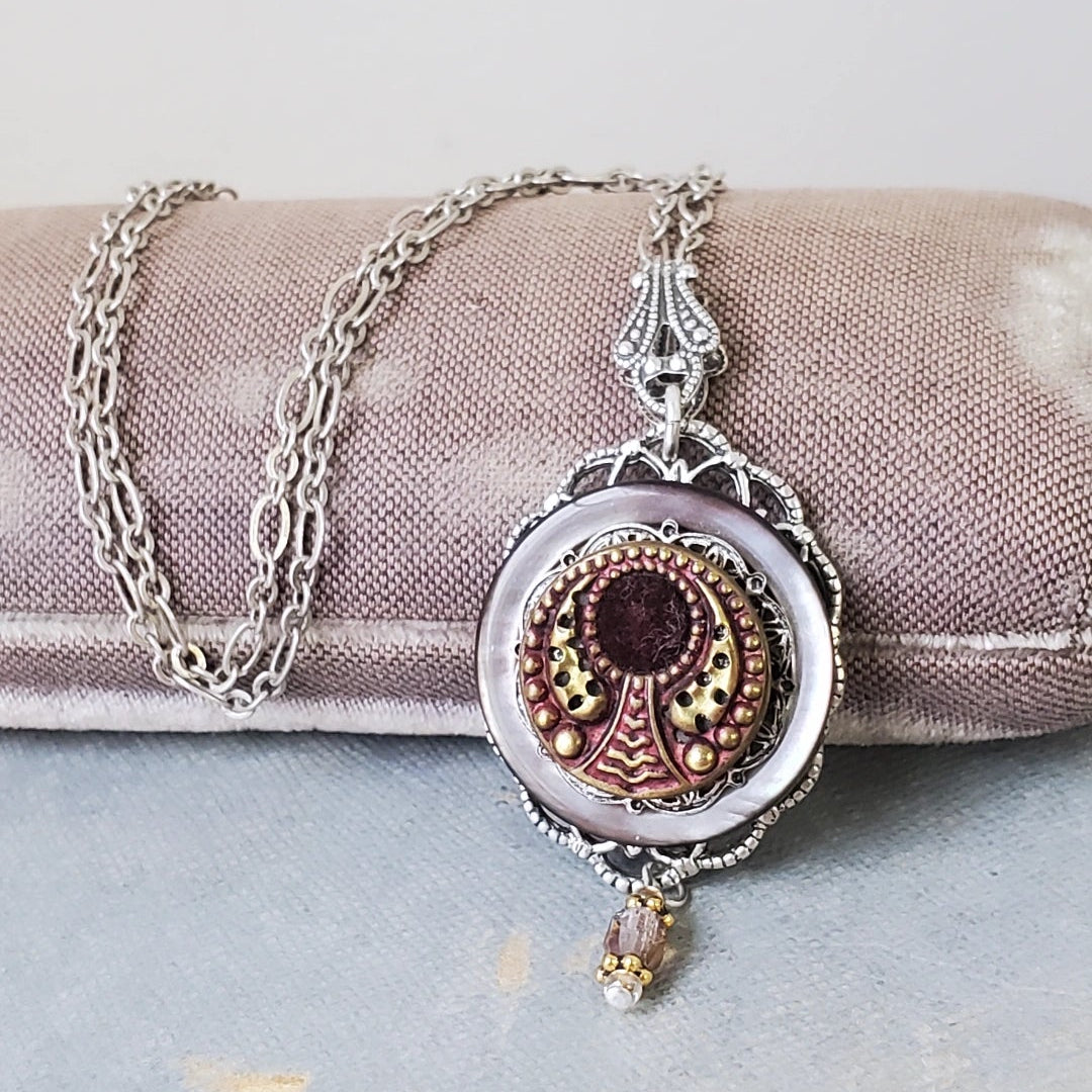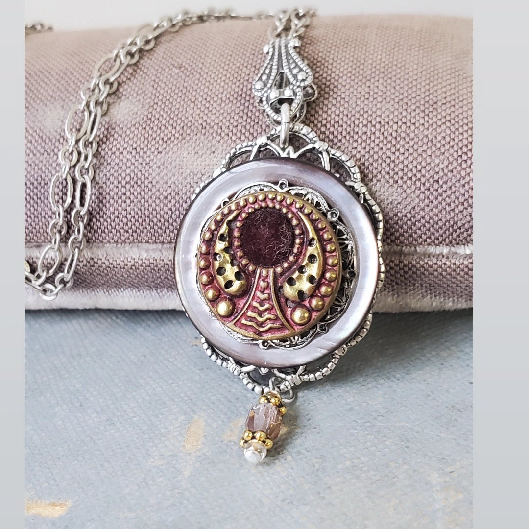 An 1860's perfume button with an angel is the focal point on this necklace. Rich burgundy velvet fabric is peeking through the middle of the button. A 1920's mother of pearl button adds to the charm. Exquisite.