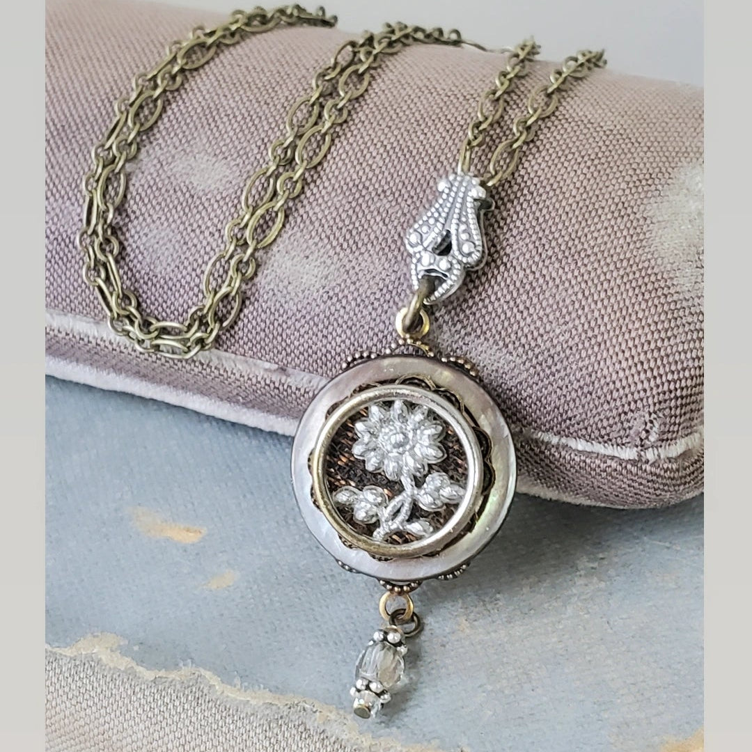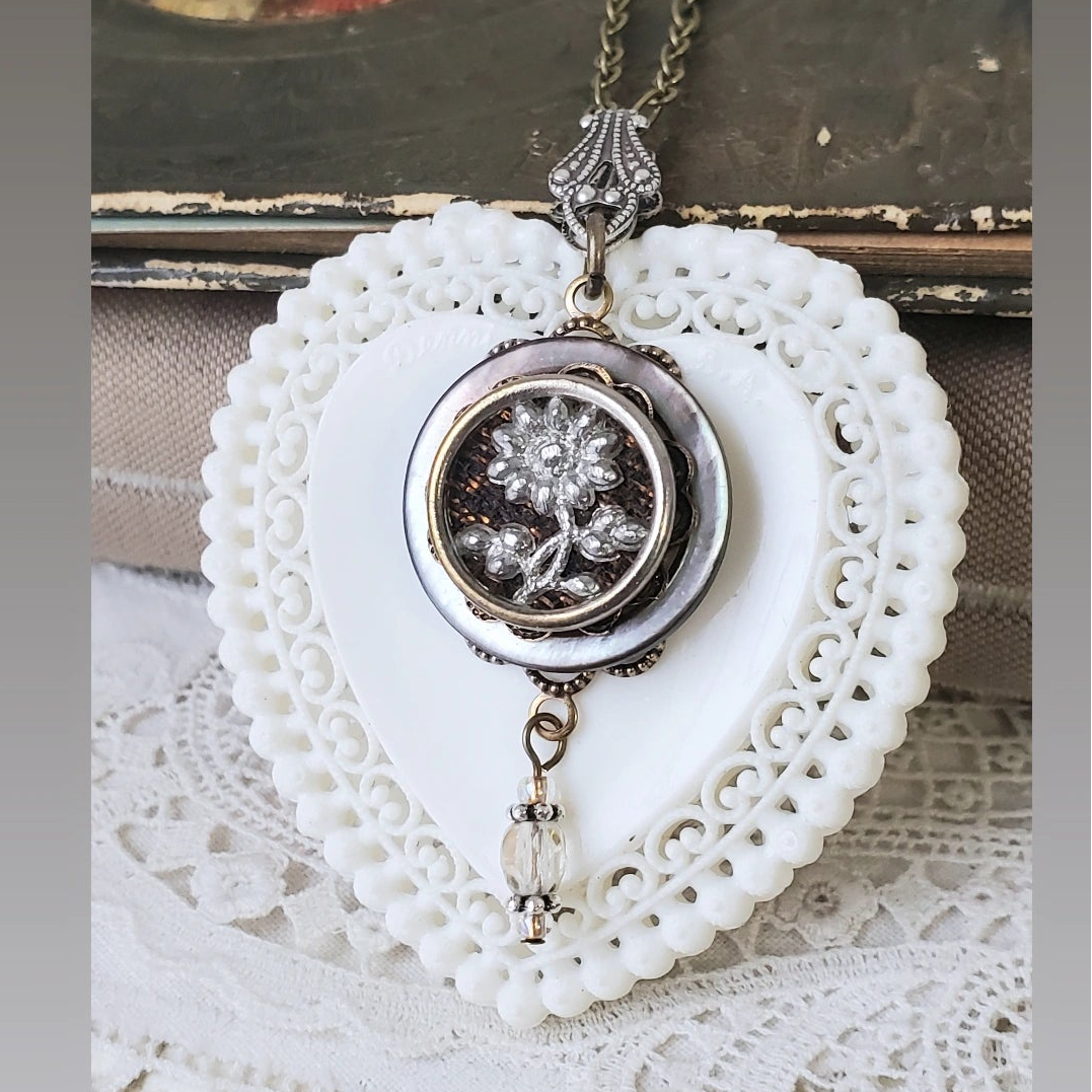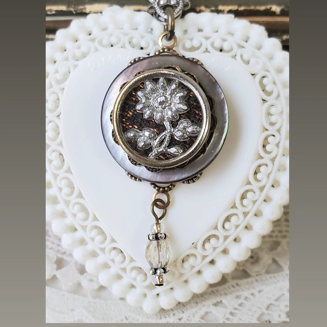 An 1860's perfume button with a silver flower pattern is the focal point on this necklace. The rich brown velvet has a copper thread in it. It is incredible. A 1920's mother of pearl button adds to the charm. Exquisite.