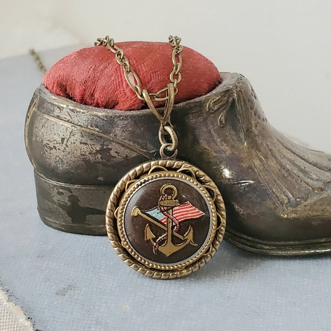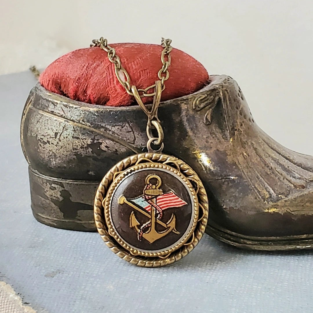 An early celluloid button featuring a flag and an anchor is the focal point of this necklace. The antique gold chain pairs perfectly with it.