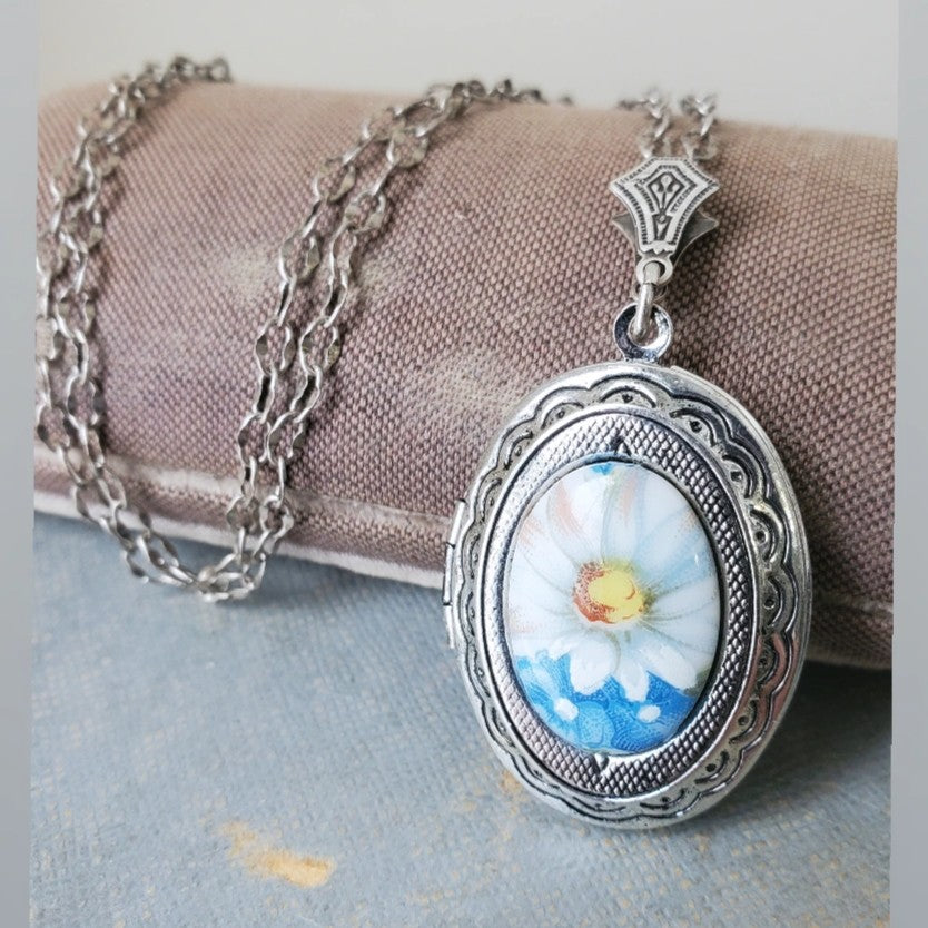 A vintage daisy cameo in a pretty blue highlights this locket necklace. Perfect for loved ones photos to hold dear to your heart.