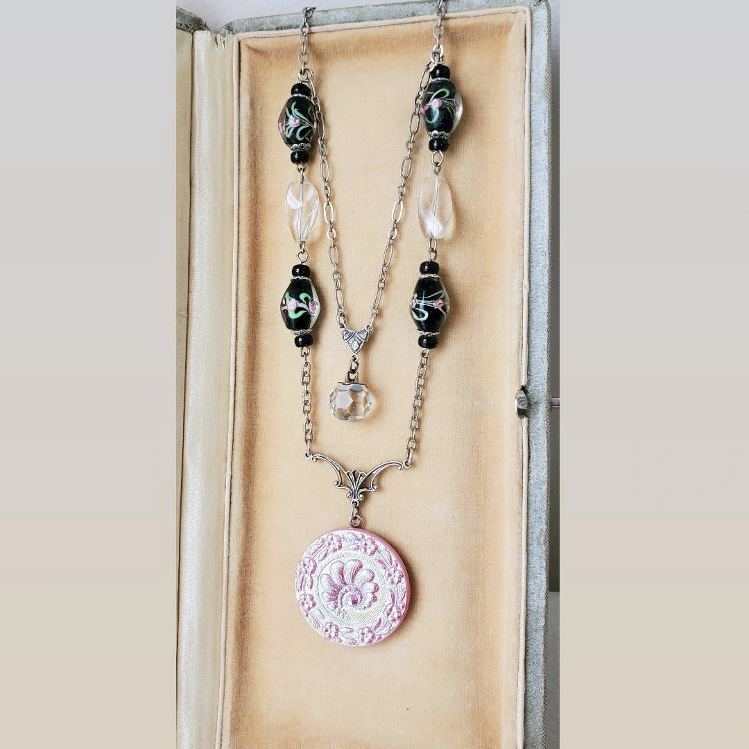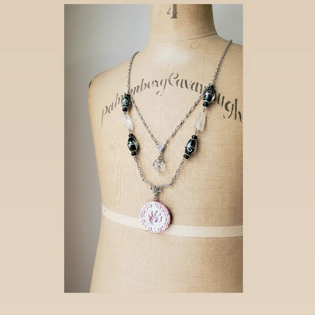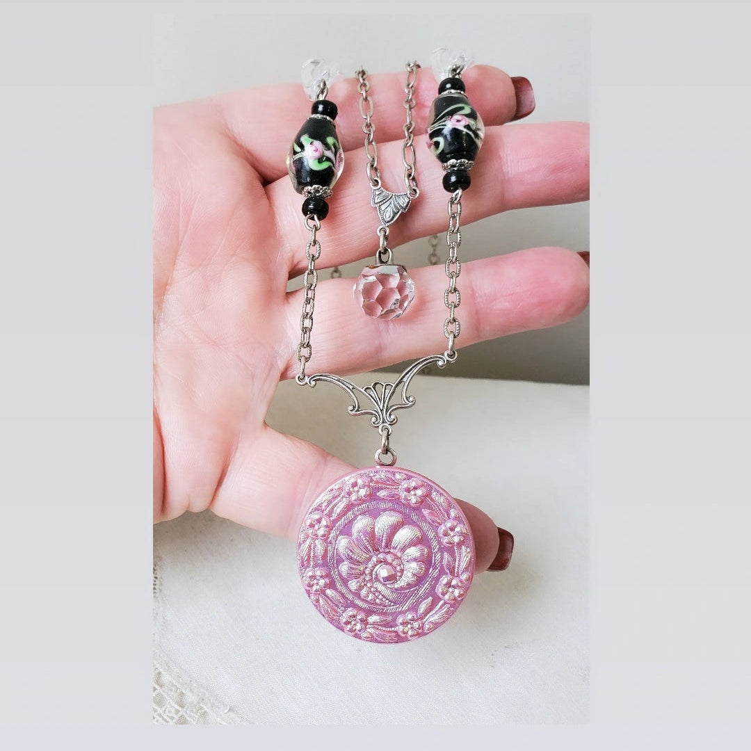This vintage Czechoslovakian glass button has the most beautiful pink luster. It Is a soft pink luster that changes to light blue and yellow as it moves. Stunning in person. It is paired up with vintage black Murano glass beads with pink and green flowers on this double layered long necklace. A 1940's cut crystal charm button hangs from the middle Murano beaded strand.